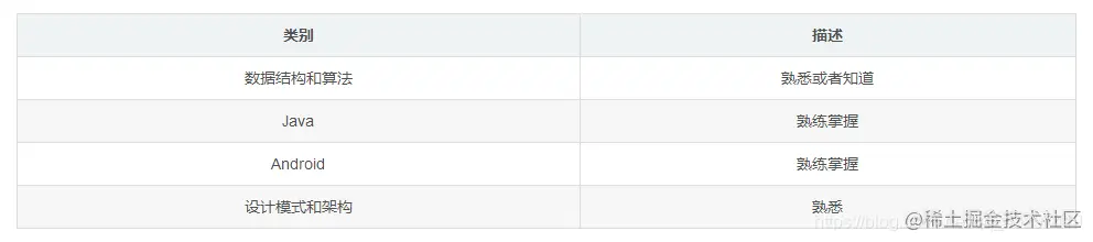 一般来说,一个Android应用开发岗位是不需要太强的数据结构和算法的,但是这并不意味着候选者可以完全不懂数据结构和算法,所以数据结构和算法大家还是要稍微了解下,由于它不是必须的,所以就算面试过程中回答的不好也没关系,只要后面的Java、Android相关的问题能够完美回答就好。有同学和我反馈,说面试挂在了数据结构和算法,这在社招中应该是不多见的,这多半是因为Android的问题也没有很好地回答出来,这就是社招和校招的不同之处,校招看基础,社招看技术深度和业务。