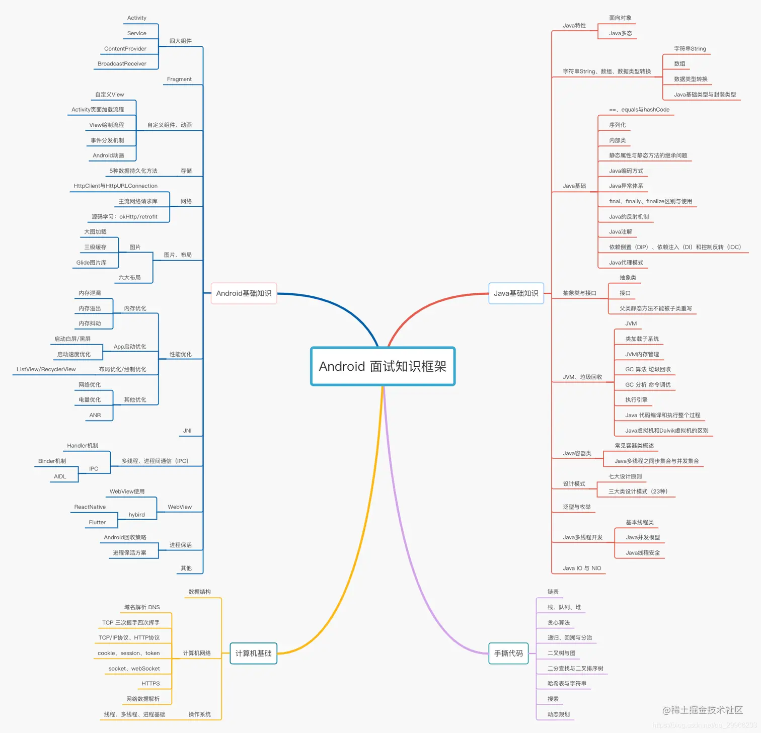 一场面试都有一个流程,拿Android面试来说,面试内容不可能全是Android问题,里面应该会有编程基础相关的问题。我对Android面试中的问题做了下分类,如下所示: