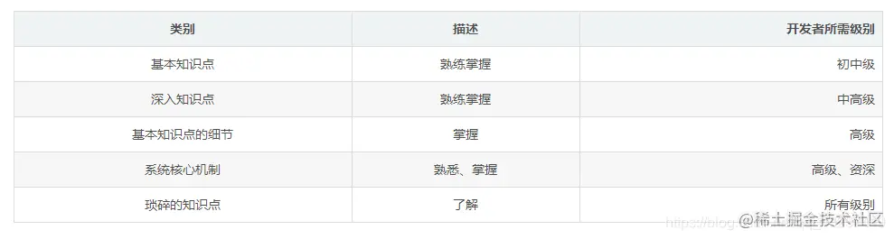 对于大部分面试者来说,大家的目标岗位应该是中高级,中级岗位(百度T4)需要掌握的知识点是:基本知识点、深入知识点;高级岗位(百度T5)需要掌握的知识点是:基本知识点、深入知识点、基本知识点的细节和系统核心机制。