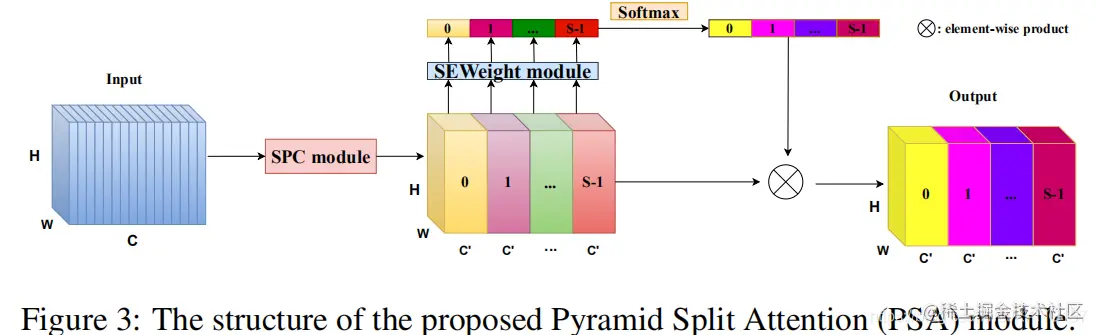 经过SPC模块后,PSA再将SPC模块的输出通过SE Weight Module获得通道注意力值,这样做的目的是获得不同尺度特征图的注意力权值。