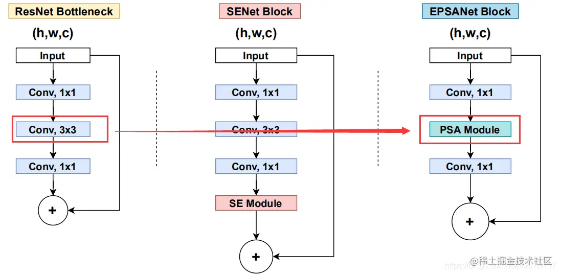 如上图所示,将PSA替代ResNet的bottleneck中的3x3卷积,再堆叠几个这样的模块就构成了EPSANet,这里的E,指的是efficient。