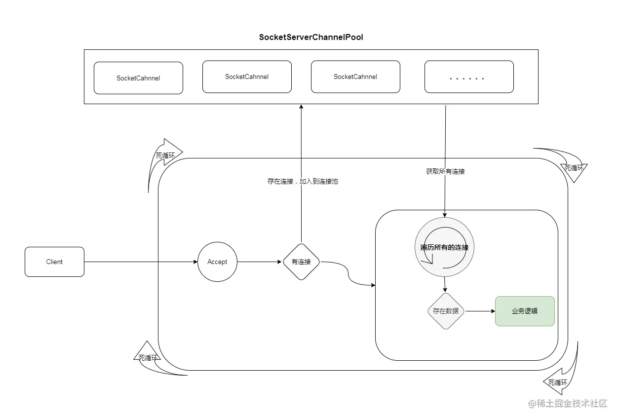 上述代码我们可以看到一个关键的逻辑:serverSocketChannel.configureBlocking(false); 这里被设置为非阻塞的时候无论是 accept还是read/write都不会阻塞!具体的为什么会非阻塞,我放到文章后面说,我们看一下这种的实现逻辑有什么问题!
