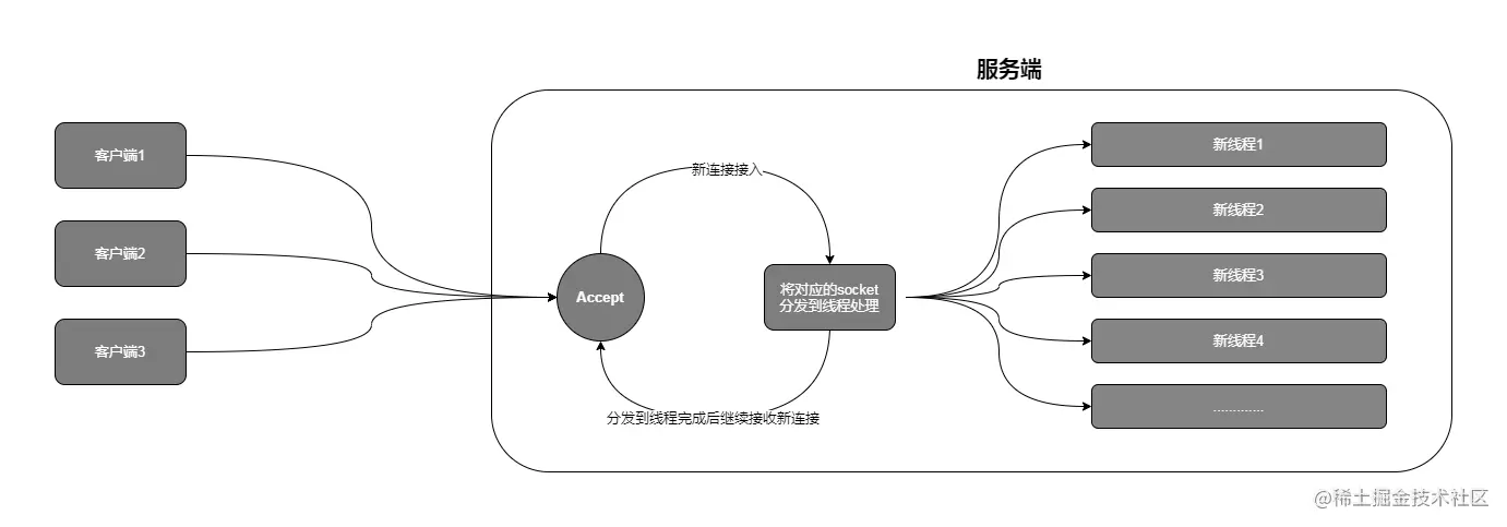我们看图发现,当一个新连接被接入后,其他客户端的连接全部处于阻塞状态,那么当该客户端处理客户端时间过长的时候,会导致阻塞的客户端连接越来越多导致系统崩溃,我们是否能够找到一个办法,使其能够将业务处理与Accept接收新连接分离开来!这样业务处理不影响新连接接入就能够解决该问题!