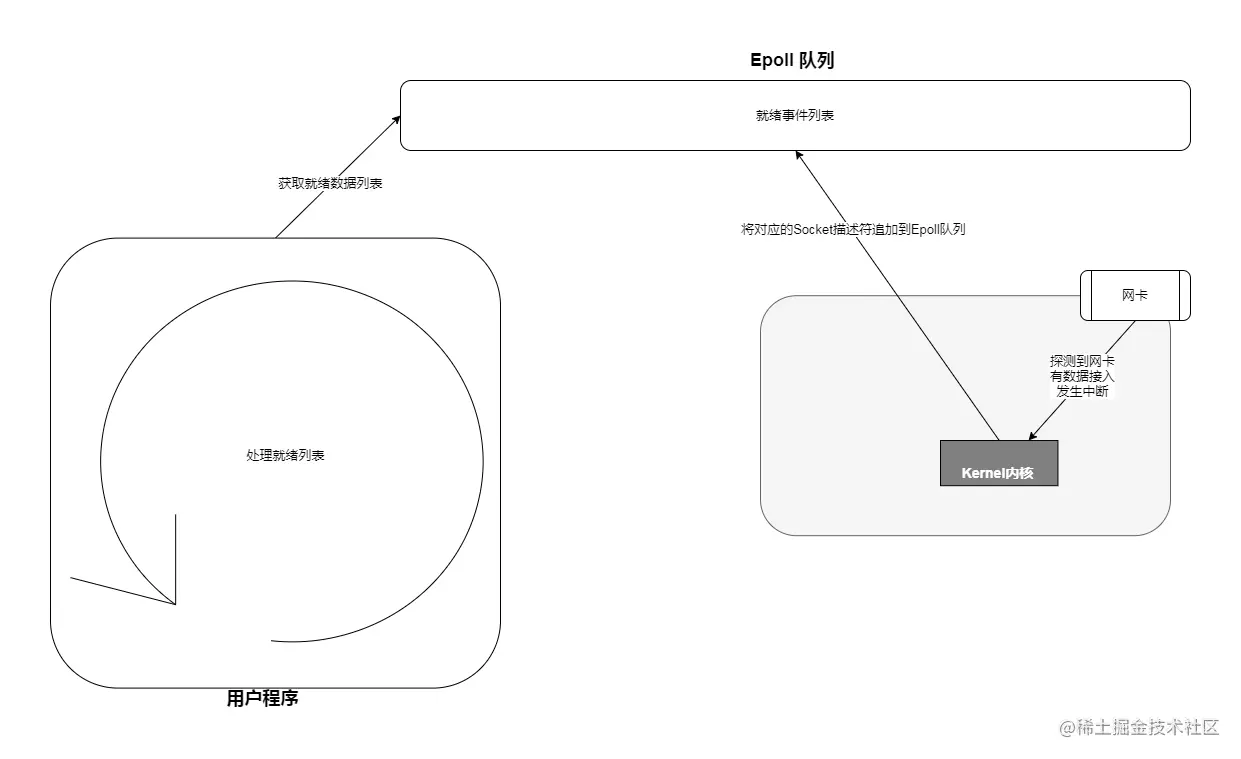 当操作系统发生中断程序后,基于端口号(客户端的端口号是唯一的)寻找到对应的Socket,获取到EPFD的引用,将该Socket的引用加入到EPFD的就序列表!