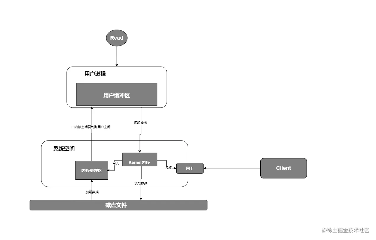 I/O相关的操作,详细各位从事java的人员并不陌生,顾名思义也就是Input/Output,对应着连个动词,Read/Write 读写两个动作,但是在上层系统应用中无论是读还是写,操作系统都不会直接的操作物理机磁盘数据,而是由系统内核加载磁盘数据!我们以Read为例,当程序中发起了一个Read请求后,操作系统会将数据从内核缓冲区加载到用户缓冲区,如果内核缓冲区内没有数据,内核会将该次读请求追加到请求队列,当内核将磁盘数据读取到内核缓冲区后,再次执行读请求,将内核缓冲区的数据复制到用户缓冲区,继而返回给上层应用系统!