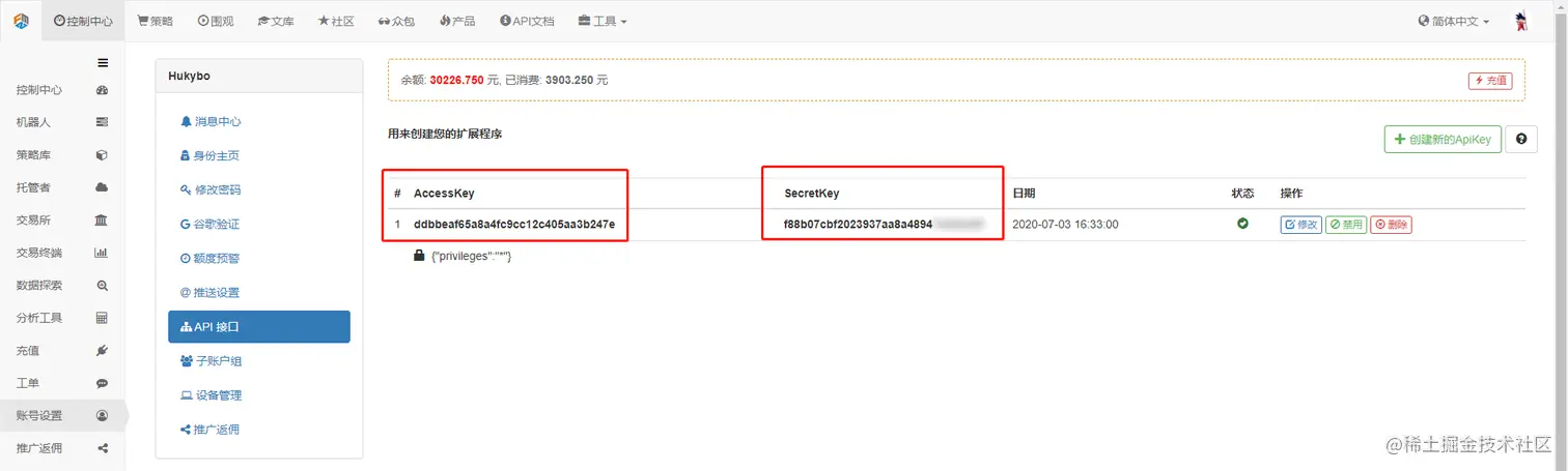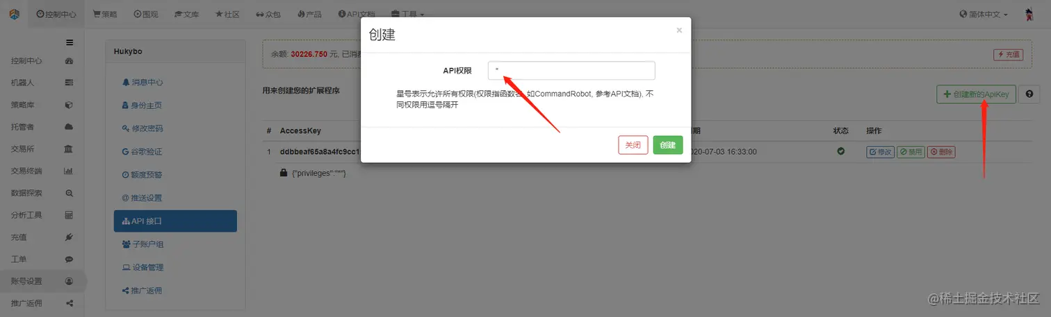 打开该链接 www.fmz.cn/m/account 选择API接口标签,然后点击右上方创建新的ApiKey,默认“*”号即开启了所有权限。创建完毕后页面就会显示“AccessKey”和“SecretKey”。