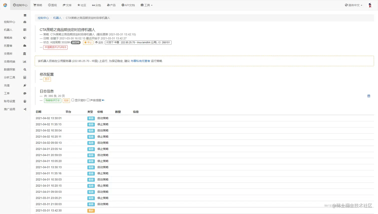 在实盘应用中,就像创建常规机器人一样部署即可。如下图所示:名字为“CTA策略之商品期货定时启停机器人”机器人管理者ID为266250的机器人。