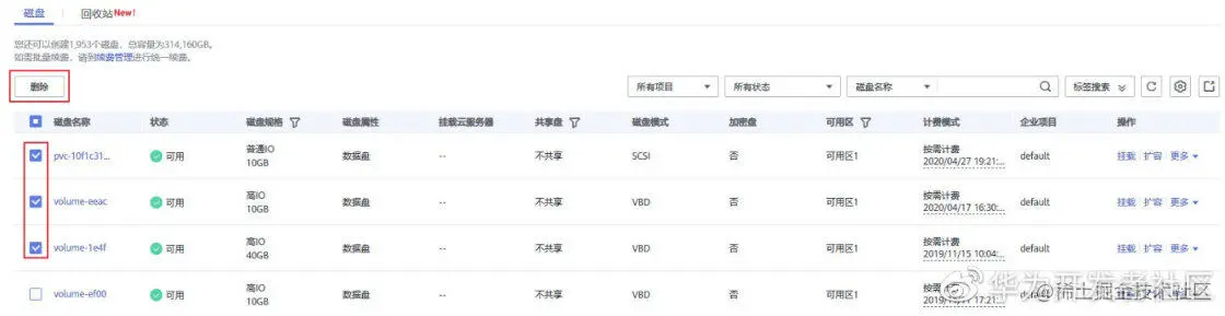 如果您有多个按需计费云硬盘待删除,可进行批量删除:在云硬盘列表中勾选多个云硬盘,单击云硬盘列表左上方的“删除”按钮即可。