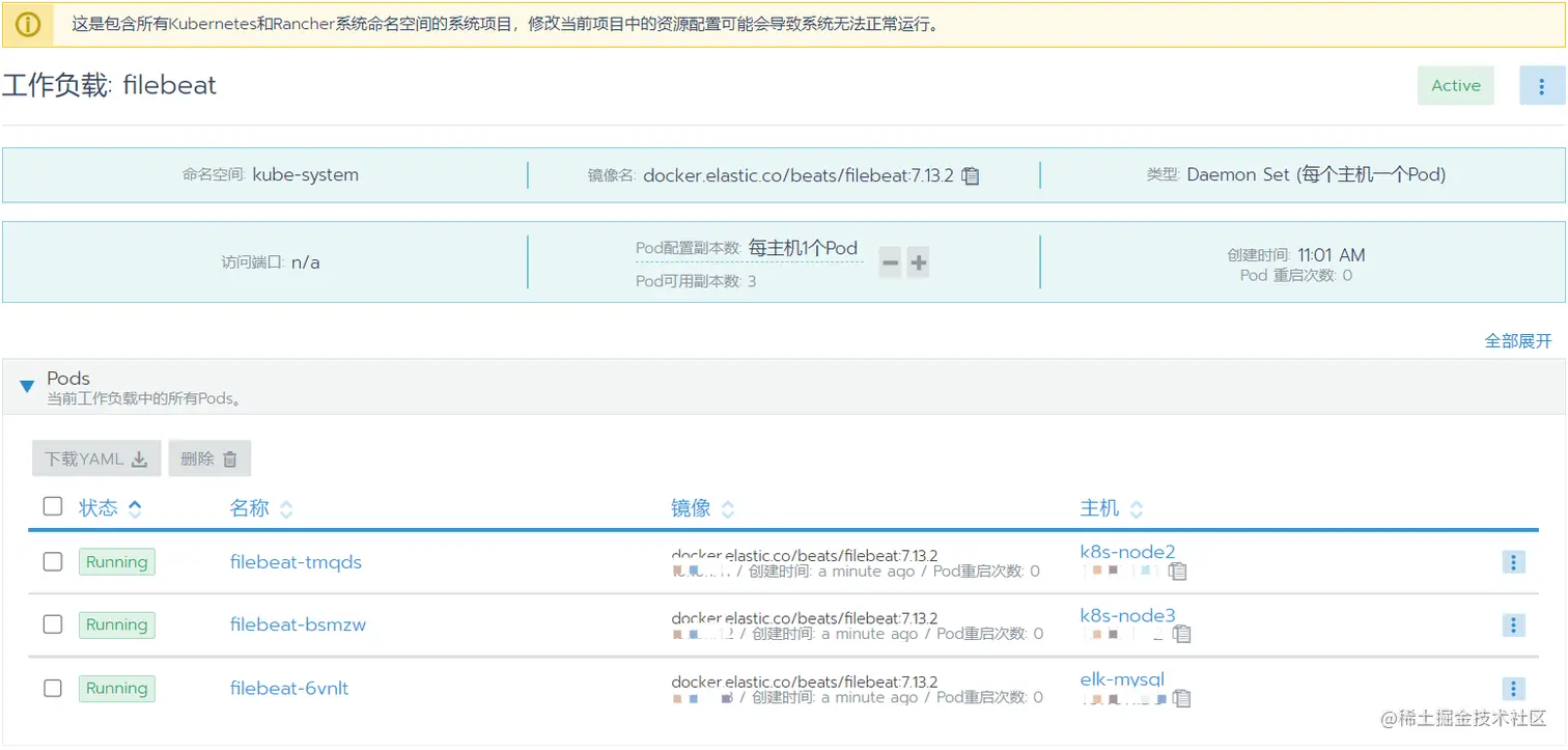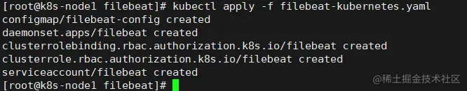 执行完,可以发现创建了服务账号,以及授权了filebeat集群资源namespace,pods,nodes资的get,watch,list权限