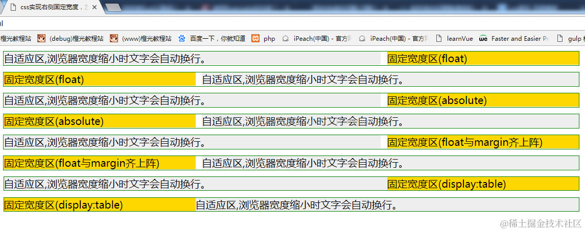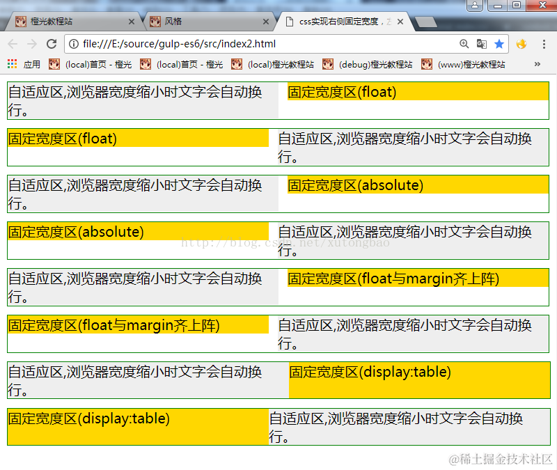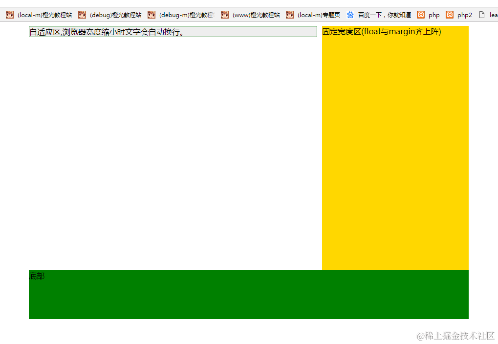 如果使用float做固定宽度的div,这个div要写在自适应div的前面,不然后导致两个div不在同一行,这是用float的弊端