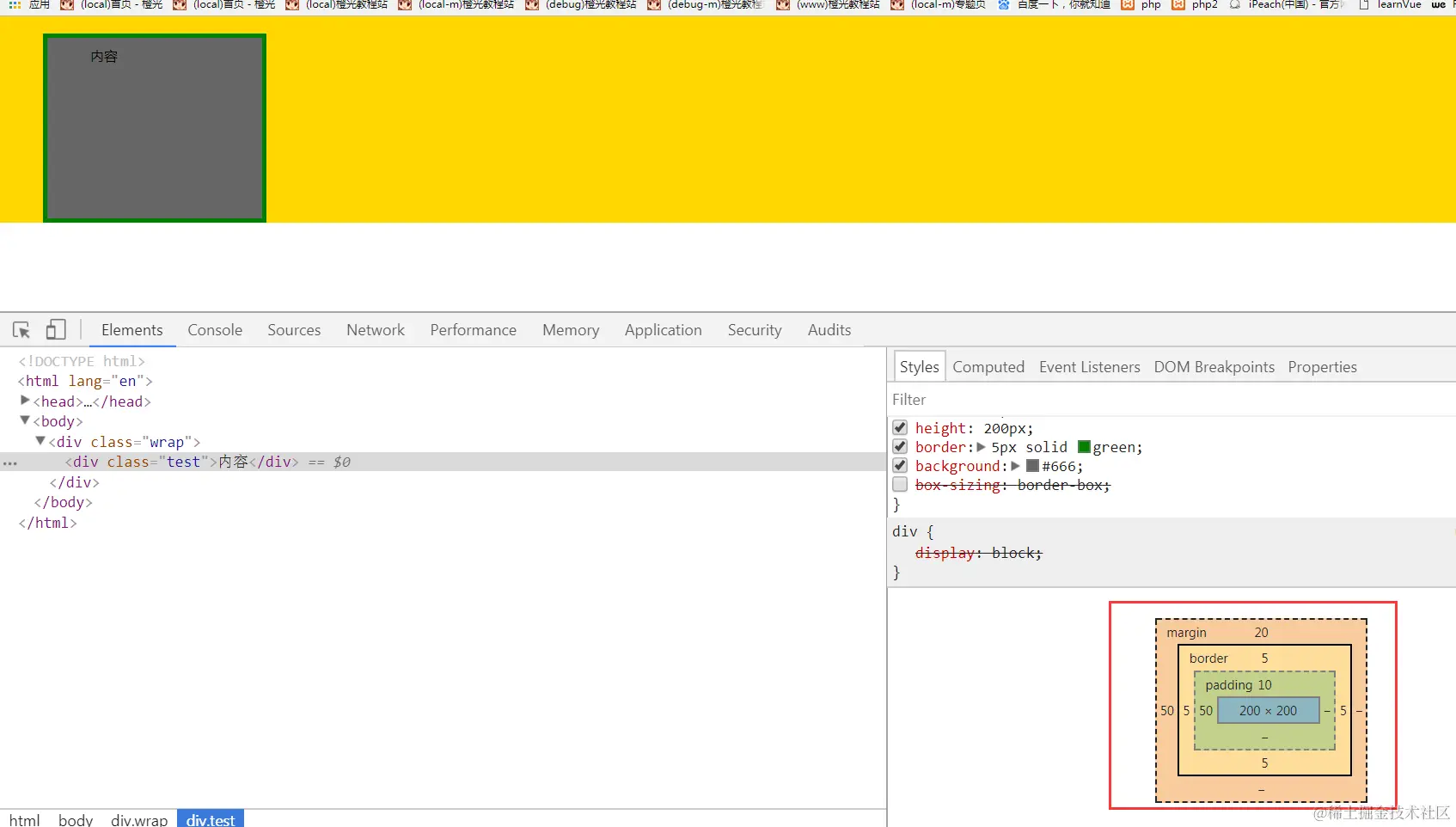 .test{display: inline-block; margin: 20px 0 0 50px;padding: 10px 0 0 50px; width:200px;height: 200px;border: 5px solid green;background: #666;