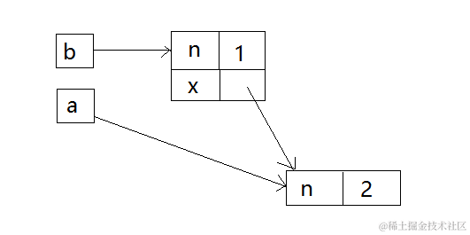 2.a 是有指针的,指向 {n:1};a.x 是没有指针的,所以创建它,指向 null。