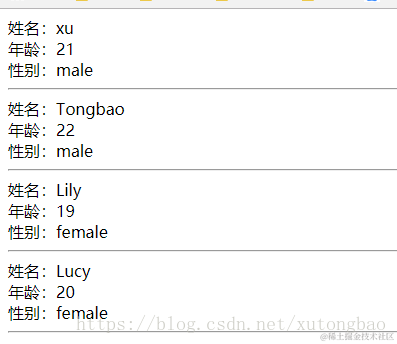 { username: 'Tongbao', age: 22, gender: 'male' },