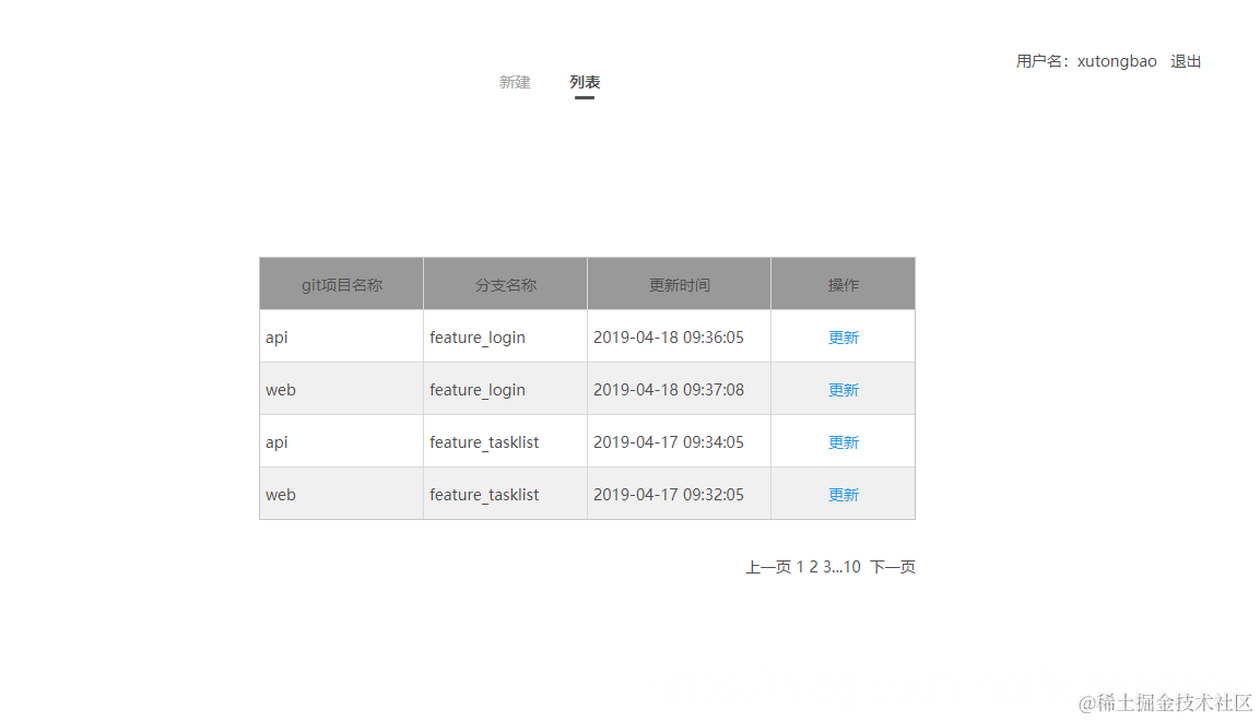 5.部署测试平台的列表页展示的是目前在测试的所有分支,程序员在分支上提交代码后,需要点击对应分支的更新按钮,