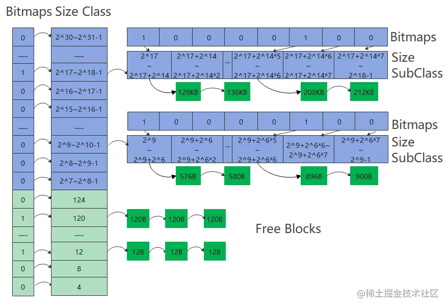 - 大于127字节的空闲内存块,按照2的次幂区间大小进行空闲链表管理。总共分为24个小区间,每个小区间又等分为8个二级小区间,见上图蓝色的Size Class和Size SubClass部分。每个二级小区间对应一个空闲链表和用于标记对应空闲内存链表是否为空的一个比特位。总共24*8=192个二级小区间,对应192个空闲链表和192/32=6个32位无符号整数位图标记。