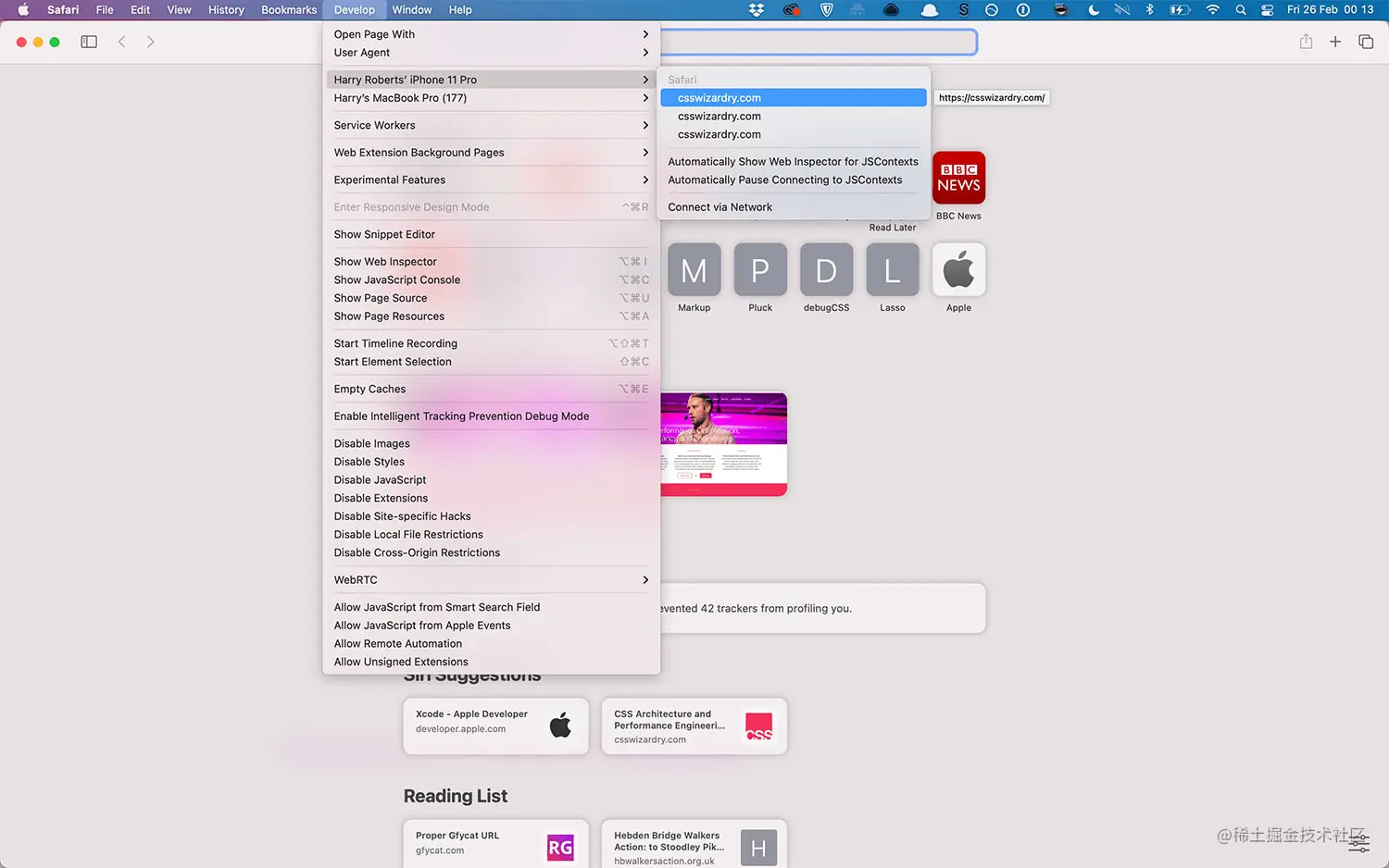 现在打开Safari浏览器。我知道,你已经有一段时间没有打开它了,所以点击⌘⎵并输入_Safari_。前往_开发_,在下拉菜单中寻找你的设备。