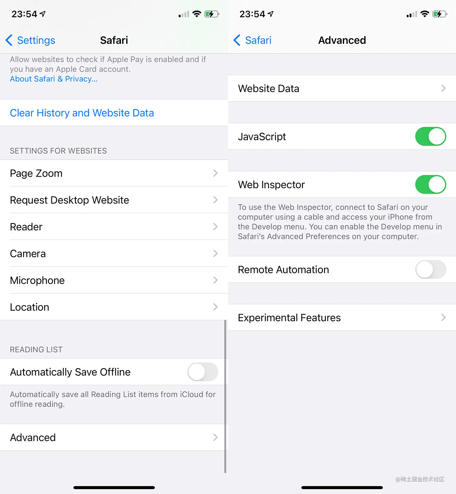 接下来,在iOS上的Safari设置中,前往 "高级"并启用_Web Inspector_。就这样了!你就可以开始了。