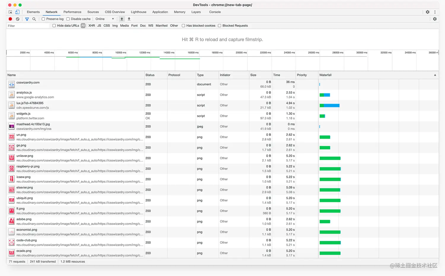 当然,这篇文章的重点是性能分析,所以让我们移到_网络_标签。如果你已经习惯了Chrome的_网络_标签,那么,我很抱歉。