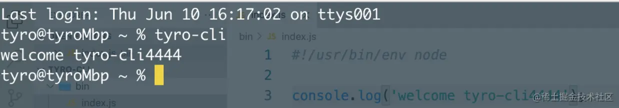 答案当然不是,脚手架本地开发调试有两种方式。前面我们已经了解了脚手架命令其实是链接到了某个具体的执行文件,我们这里tyro-cli命令链接指向的是 bin/index.js。所以第一种本地运行调试的方法是在本地包目录下直接执行 bin/index.js :