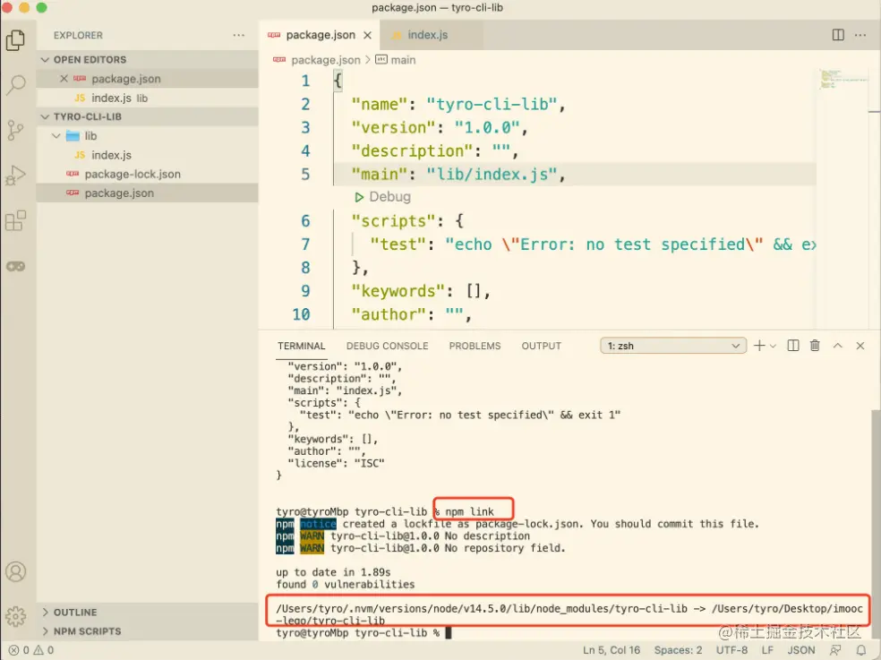 在 tyro-cli 中 执行 npm link tyro-cli-lib 指令即可,但要注意一点,tyro-cli 项目中的package.json文件并没有自动添加对 tyro-cli-lib的依赖。