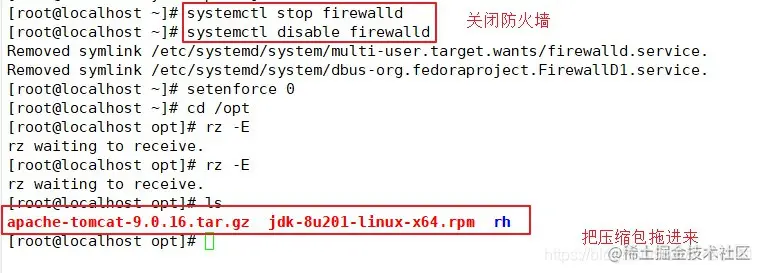 (1)关闭防火墙,将安装 Tomcat 所需软件包传到/opt目录下