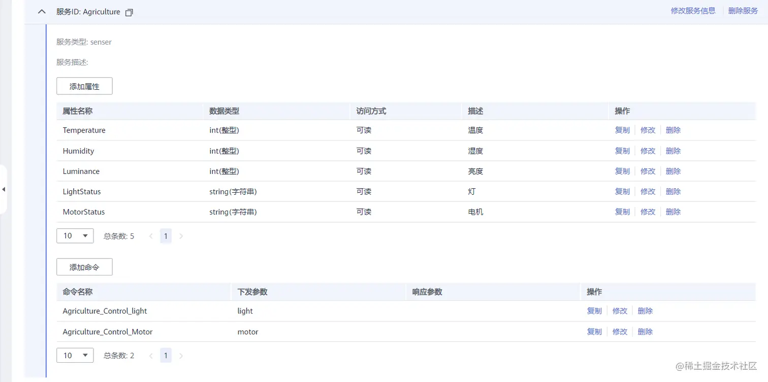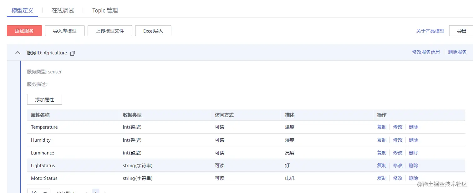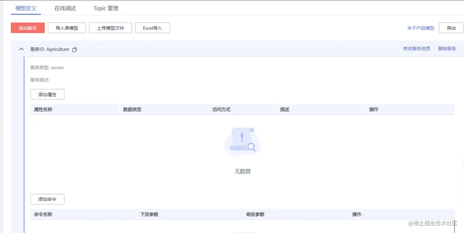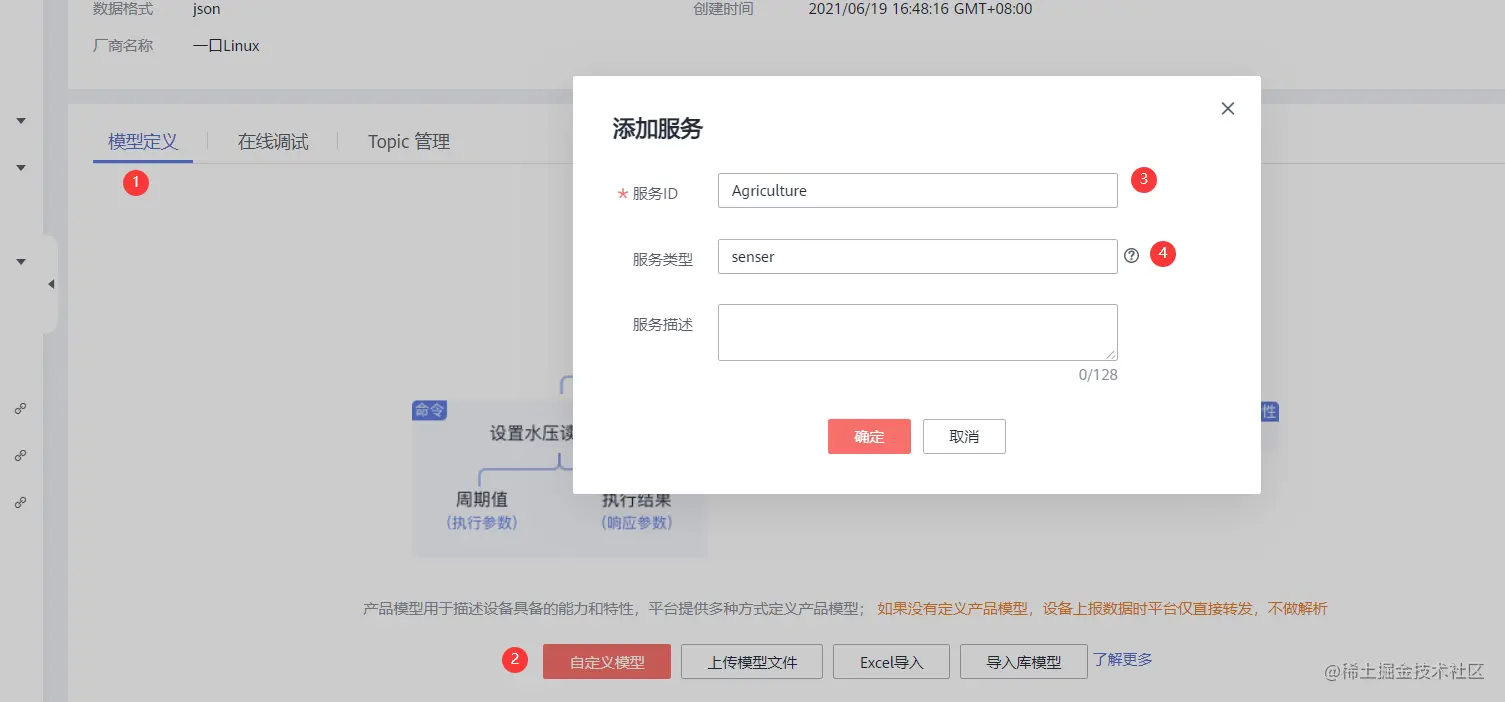定义一个服务模型,「服务ID」随便起名字,这里填入Agriculture,「服务类型」填入senser。点击确定,完成服务的添加。