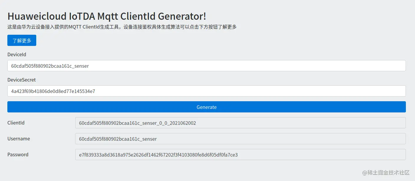 接着我们利用获取的密钥,生成直连MQTT所需的ClentID,通过这个链接跳转:iot-tool.obs-website.cn-north-4.myhuaweicloud.com/