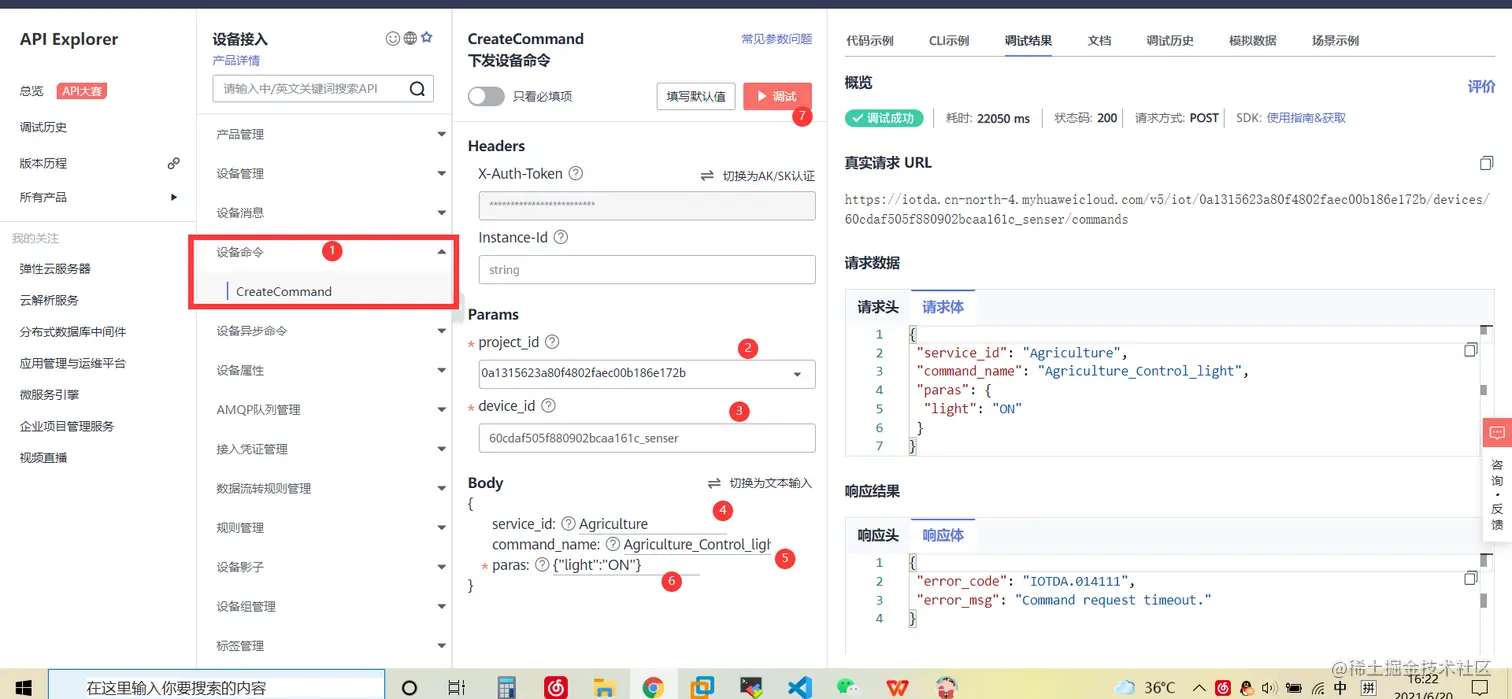 目前开放有Java、python、node.js、php等,可以根据个人的需求,构建前端。这里我们先调试API,选择一个设备命令,按照图示操作。 注意Body里面的参数,与我们上文产品的属性是一样的,其中paras的参数,填写要符合图片给出的规范,也就是JSON的格式。