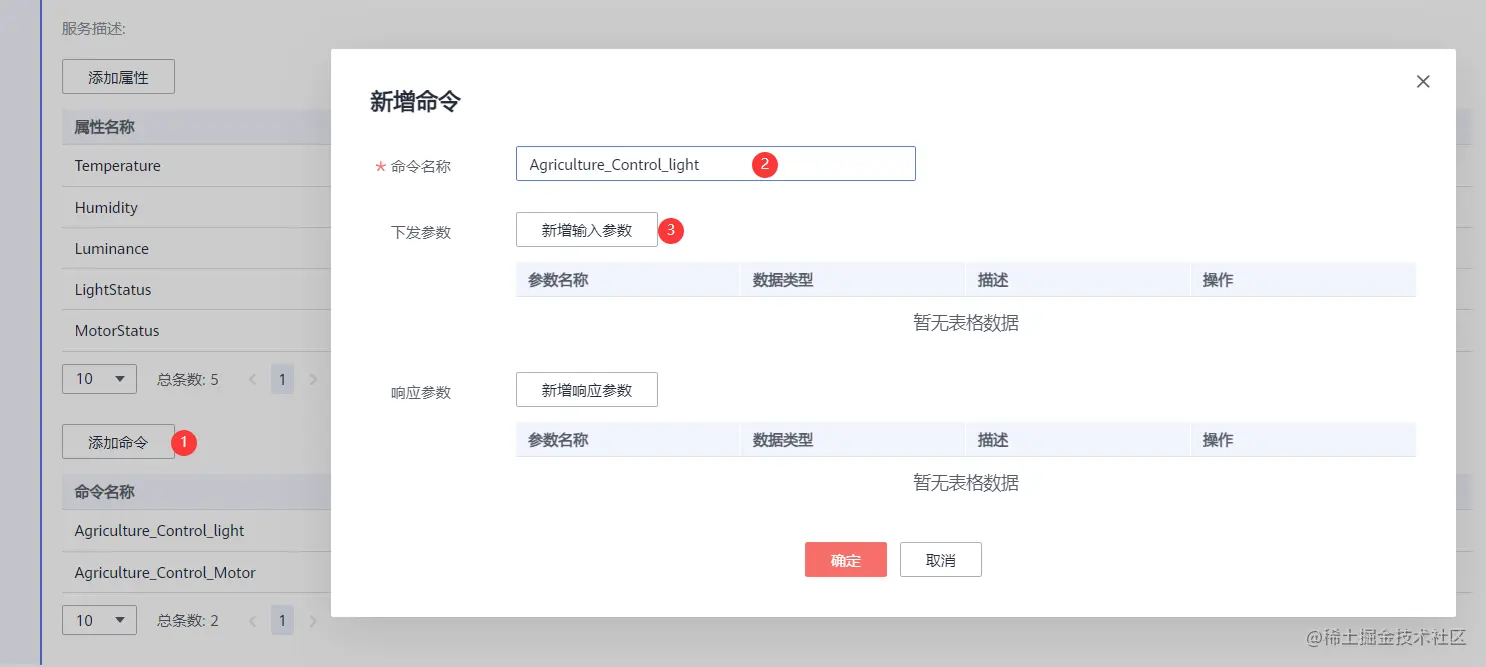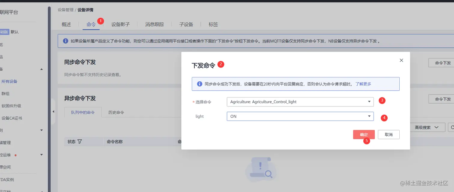在华为云平台设备详情页,单击“命令”,选择同步命令下发,选中创建的命令属性,单击“确定”,即可发送下发命令控制设备。