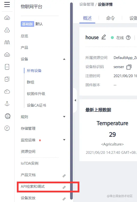 回到华为云平台,平台上的设备显示为在线状态