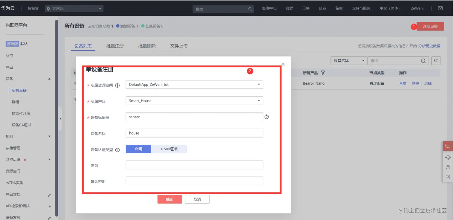我们往下进行,点击「设备」, 选择「注册设备」填写设备属性, 「所属资源空间」选择默认账户的即可, 「所属产品」选择上面自己创建的产品, 「设备标识码」填写senser, 「设备名称」填写house,其他保持默认, 点击确定完成创建。