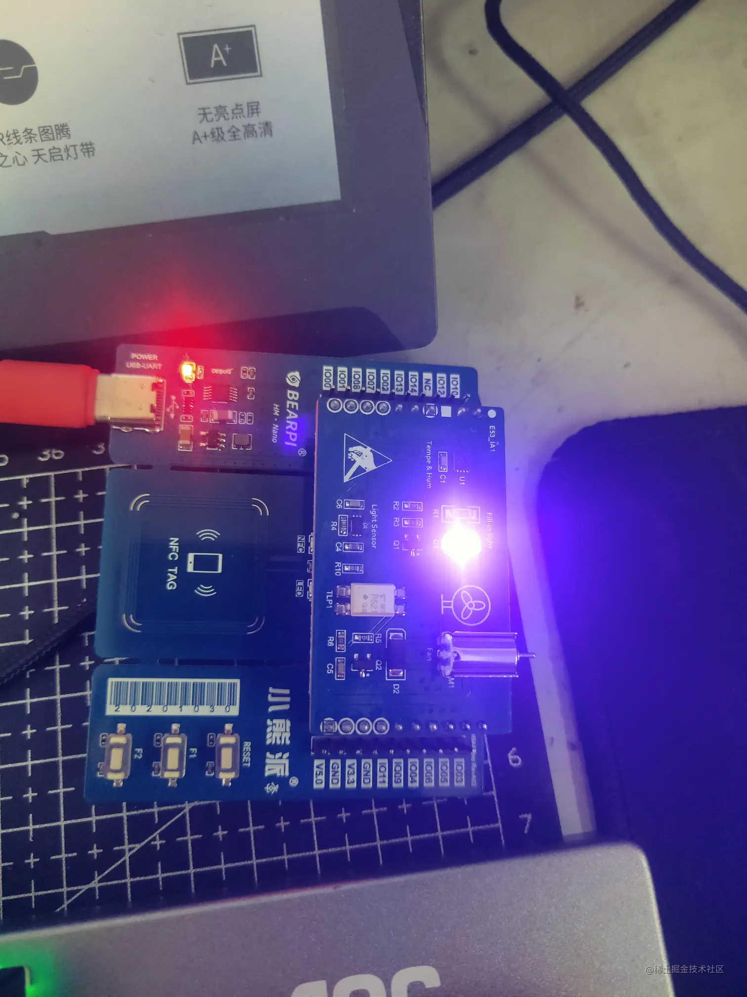 硬件环境使用小熊派·鸿蒙季开发板和E53_IA1扩展板(有温湿度光强传感器和电机)。