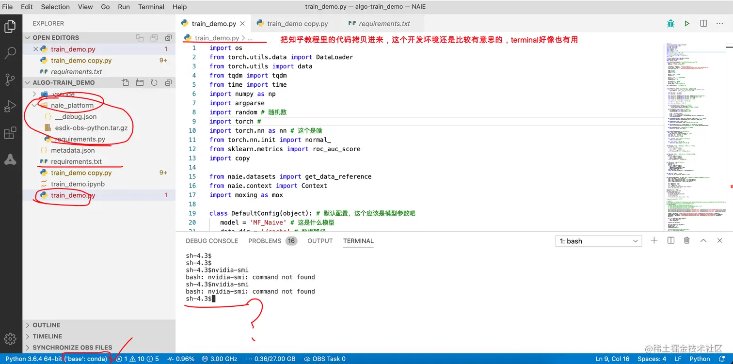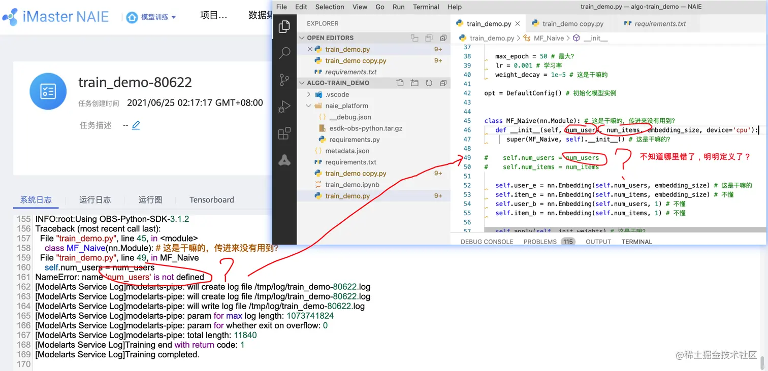 因为拷贝过来时,代码缩进乱了,所以对照知乎文章PCIC 2021: Causal Inference and Recommendation赛题样例代码 - 知乎把缩进搞下,然后就提交到华为平台训练出结果,本来还想着注释好了改成自己的代码然后在本地电脑/colab运行的。