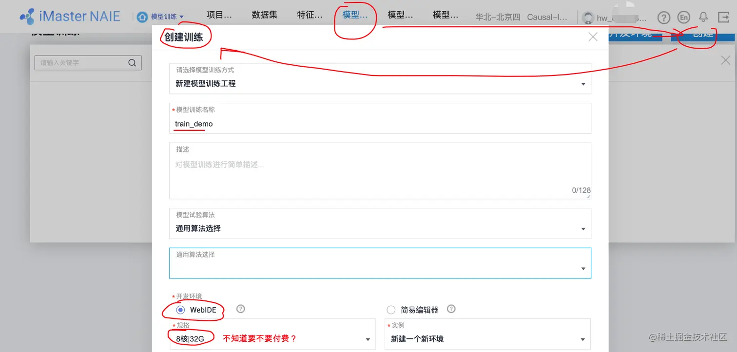 然后进入“模型训练”页面“新建模型训练工程”,选择WebIDE,创建一个WebIDE大概需要3-5分钟: