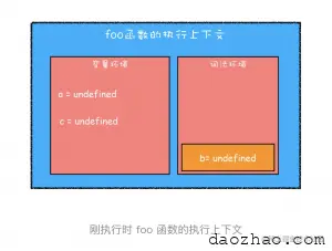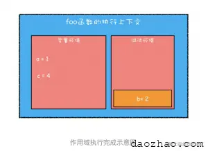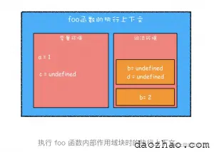从图中看出,当进入函数的作用域块时,作用域块中通过 let 声明的变量,会被存放在词法环境的一个单独的区域中,这个区域中的变量并不影响作用域块外面的变量,比如在作用域外面声明了变量 b,在该作用域块内部也声明了变量 b,当执行到作用域内部时,它们都是独立的存在。