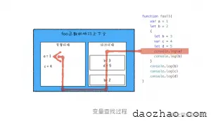 再接下来,当执行到作用域块中的console.log(a)这行代码时,就需要在词法环境和变量环境中查找变量 a 的值了,具体查找方式是:沿着词法环境的栈顶向下查询,如果在词法环境中的某个块中查找到了,就直接返回给 JavaScript 引擎,如果没有查找到,那么继续在变量环境中查找。