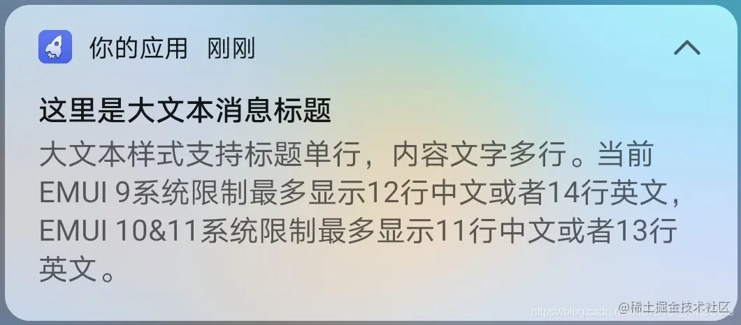 早期版本推送服务,默认样式下仅支持单行文本,单行文本支持的字数太少,会有表达不全的缺陷。大文本样式支持标题单行,内容文字多行(当前EMUI 9系统限制最多显示12行中文或者14行英文,EMUI 10&11系统限制最多显示11行中文或者13行英文)。大文本展开后效果如下: