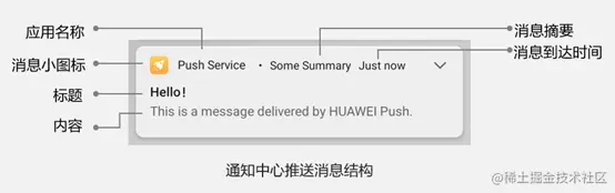 首先,借助官方开发文档给出的示例,介绍通知栏消息的结构。