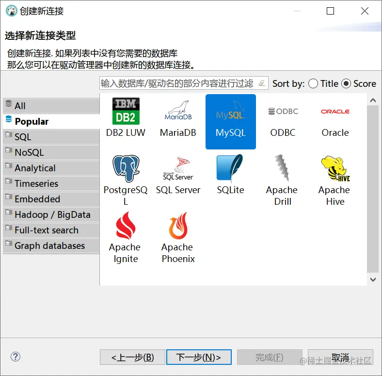 - 选择对应数据库软件,我们这里以 MySQL 为例,然后选择下一步;