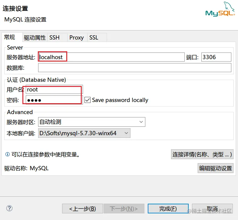 - 输入数据库的地址、用户名、密码、端口号(默认是 3306)等信息,然后点击完成即可;