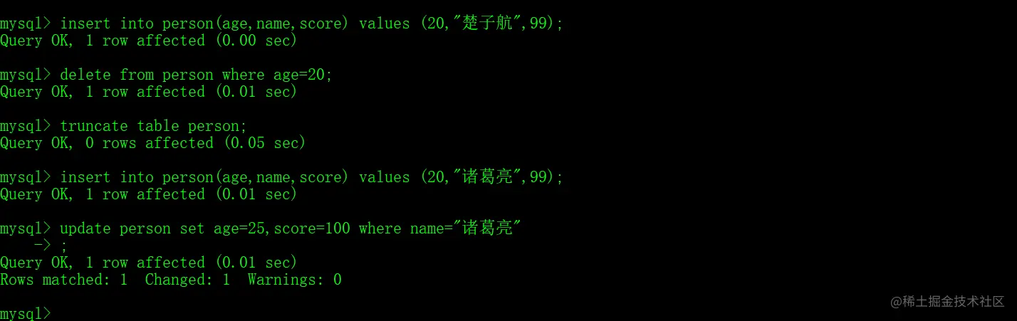 DELETE FROM 表名 [WHERE 条件];- 删除所有数据,先删除表,然后创建一张结构一样的表,比