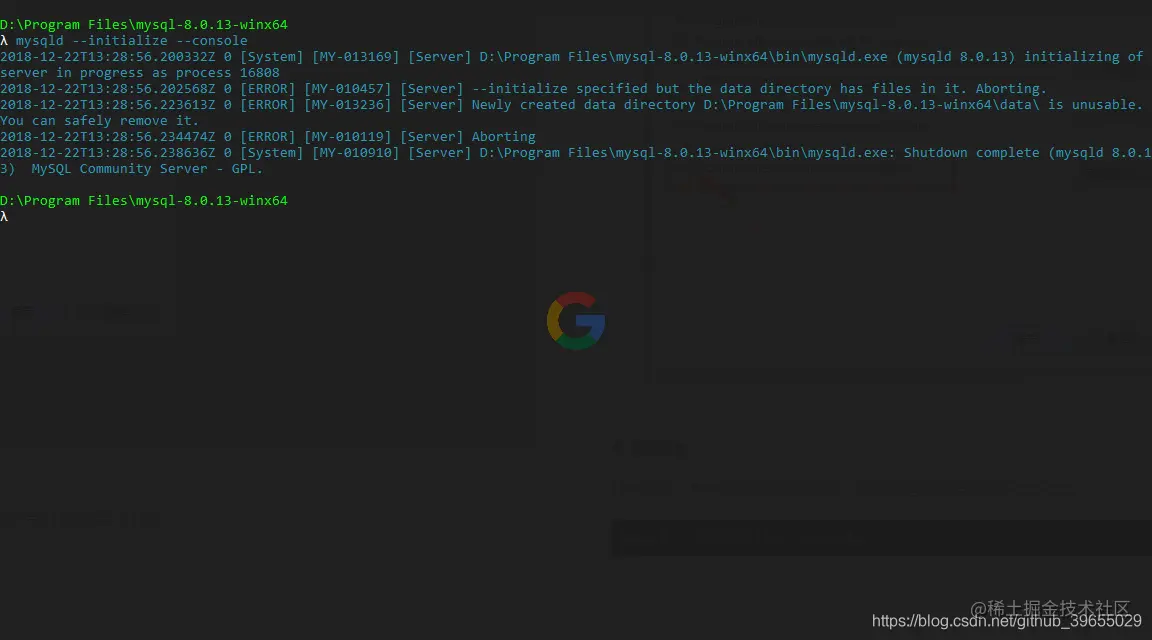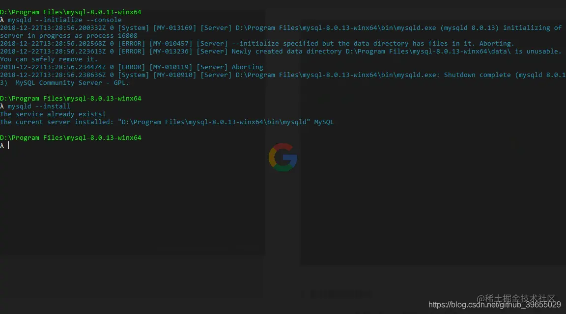 控制台进入 MySQL 解压后的路径,然后以管理员身份执行如下命令;