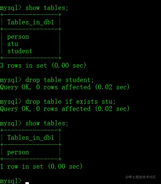 DROP TABLE 表名;- 判断表是否存在,存在则删除
