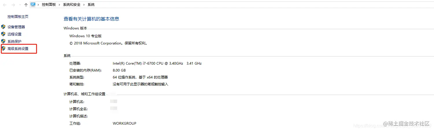 打开控制面板->系统与安全->系统,进入高级系统设置,如下图所示;