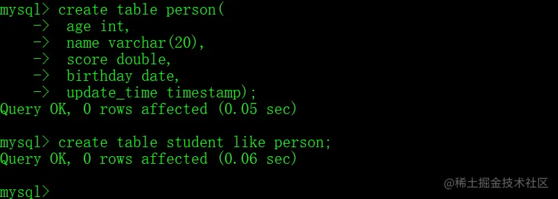 类型 说明 int整数类型 double小数类型 varchar字符串 date日期,只含年月日 datetime日期,不仅包含年月日,还包括时分秒 timestamp时间戳,包含年月日时分秒 - 表复制