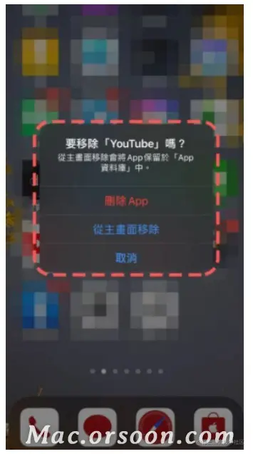 这样当你在主画面中要删除App 时,便会跳出一个提醒的讯息,询问你是否要「移除App」,这边的「移除」只是将App 从主画面中移除,而移除的App 依然是存在手机里面的,只是在主画面看不到,但是可以从App 资料库中存取。