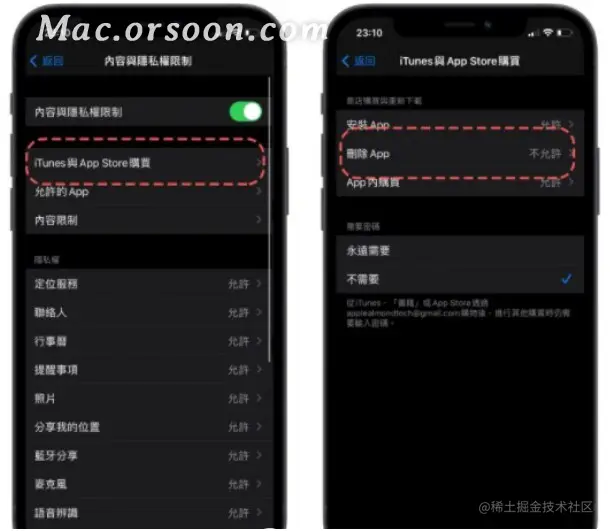 接着在下一个画面中点击「iTunes 与App Store 购买」项目,然后将「删除APP」这个功能设定为「不允许」。