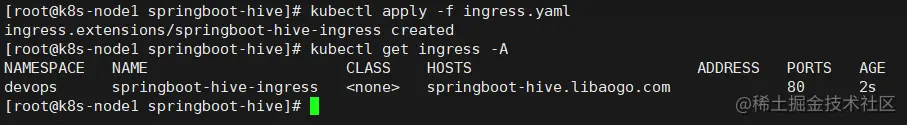 因为我们没有做DNS解析,所以这里还需要将该域名 写到hosts中。spingboot-hive.libaogo.com对应的IP 选择k8s集群任意一台node节点IP 既可