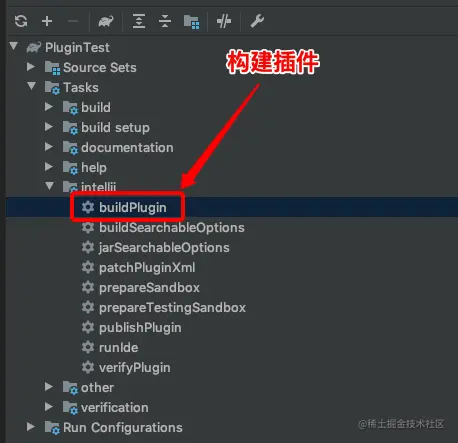 截止到第四步,都只是在调试IDE里查看效果,如果一个插件开发完成后,需要被实际的IDEA安装,这个时候就需要借助打包选项来打包你的插件,点击下面的选项构建插件: