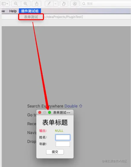 经过上面三步的配置,插件的基本样式已经展示出来,但是点击下方“表单测试”的action,并没有什么用,因为其绑定的FormAction类里没有任何有意义的实现。现在来实现开始的目标,点击“表单测试”后,弹出一个自定义的表单会话框,然后点击按钮,获取表单内容后打印在会话框内。